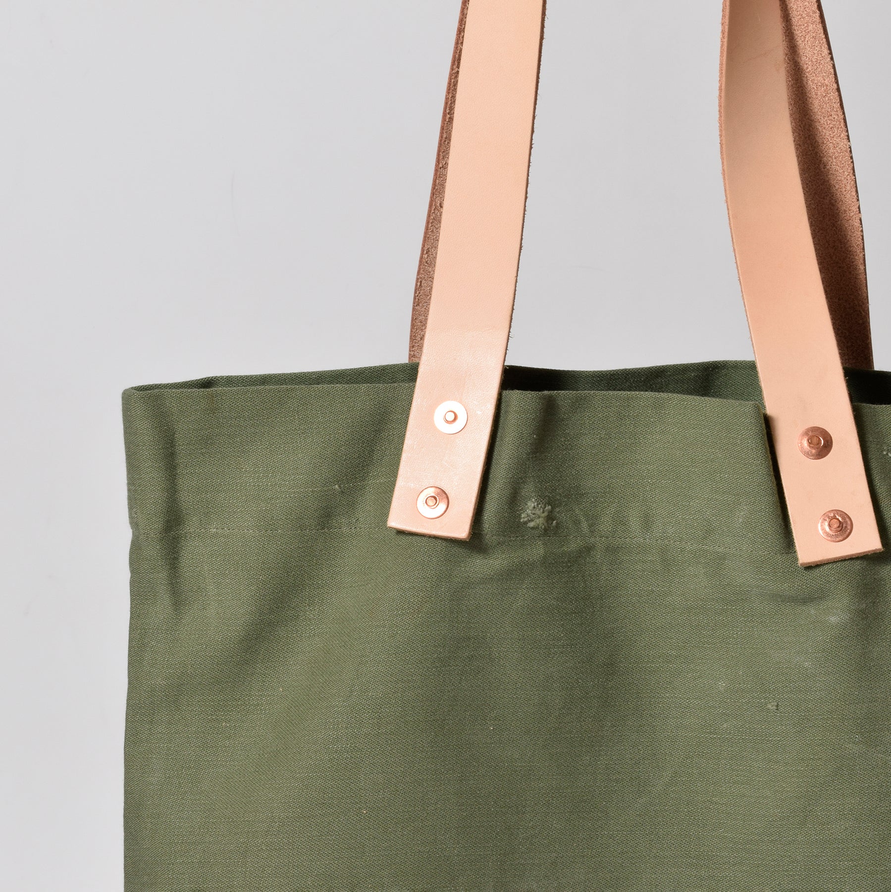 50〜80年代の米軍で使用されていたランドリーバッグを再構築し、姫路産ヌメ革ハンドルで仕立てたフラットトート。